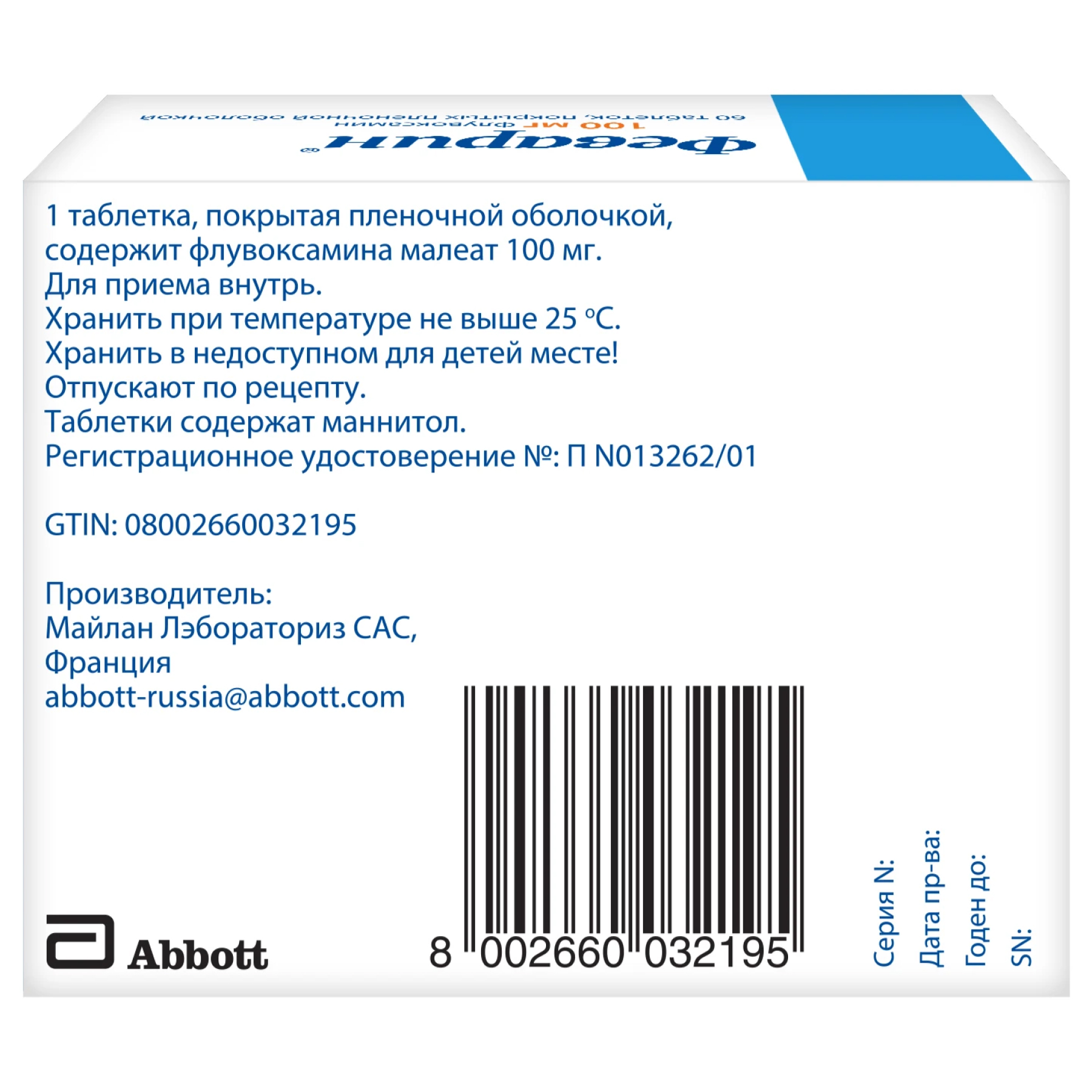 Каждая таблетка, покрытая пленочной оболочкой, содержит 100 мг флувоксамина (в виде флувоксамина малеата).