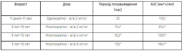 Недоношенным детям (гестационный возраст около 28 недель) флуконазол вводили внутривенно в дозе 6 мг/кг каждый 3-й день до введения максимум 5 доз в то время, пока дети оставались в отделении интенсивной терапии. Средний период полувыведения составлял 74 ч (в пределах 44-185 ч) в 1-й день, с уменьшением на 7-ой день в среднем до 53 ч (в пределах 30-131 ч) и на 13-й день в среднем до 47 ч (в пределах 27-68 ч).