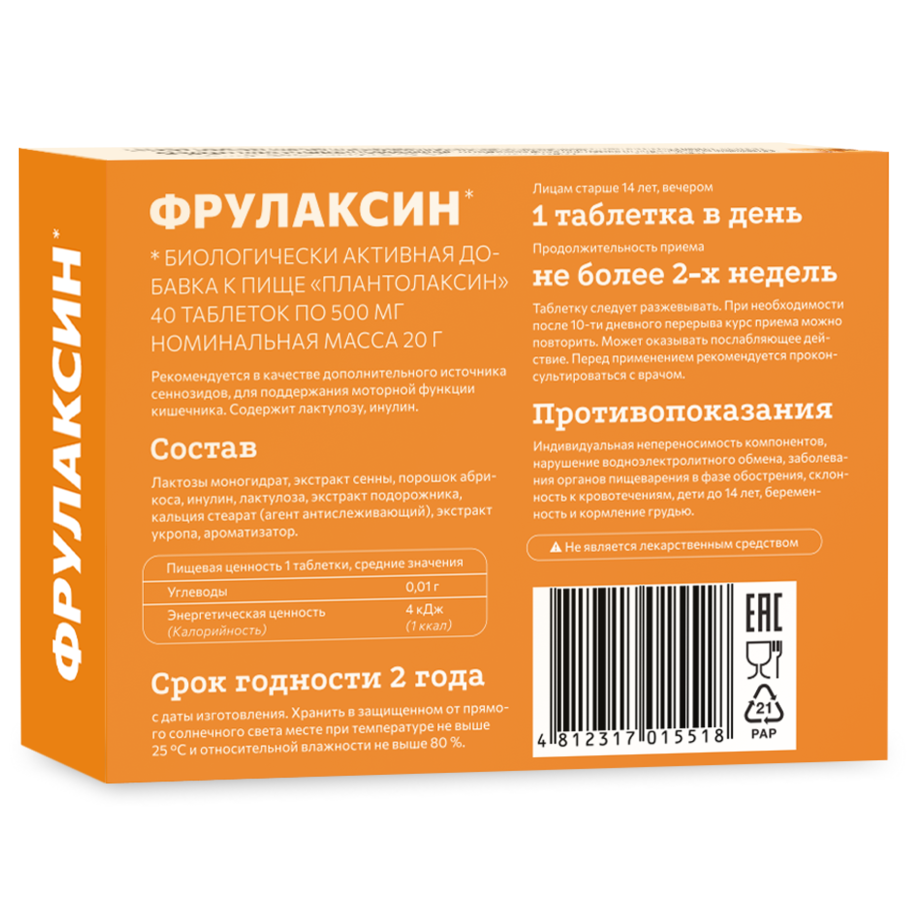 Рекомендуется в качестве дополнительного источника сеннозидов, для поддержания моторной функции кишечника. Содержит лактулозу, инулин.