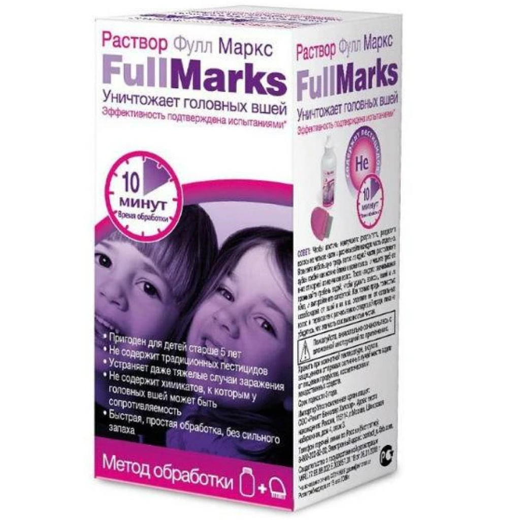 Фулл маркс оказывает физическое воздействие на вшей, приводя к их дегидратации (обезвоживанию) и смерти. В отличие от сопротивляемости вшей некоторым пестицидам, которые используются в других средствах, в настоящее время не выявлены механизмы сопротивляемости головных вшей эффекту обезвоживания! После применения, Вы сможете удалить мертвых вшей и их яйца гребнем Full Marks для вычесывания. Каждый курс обработки требует примерно 50 мл раствора. Благодаря отсутствию сильного запаха раствор Full Marks приятнее в использовании.