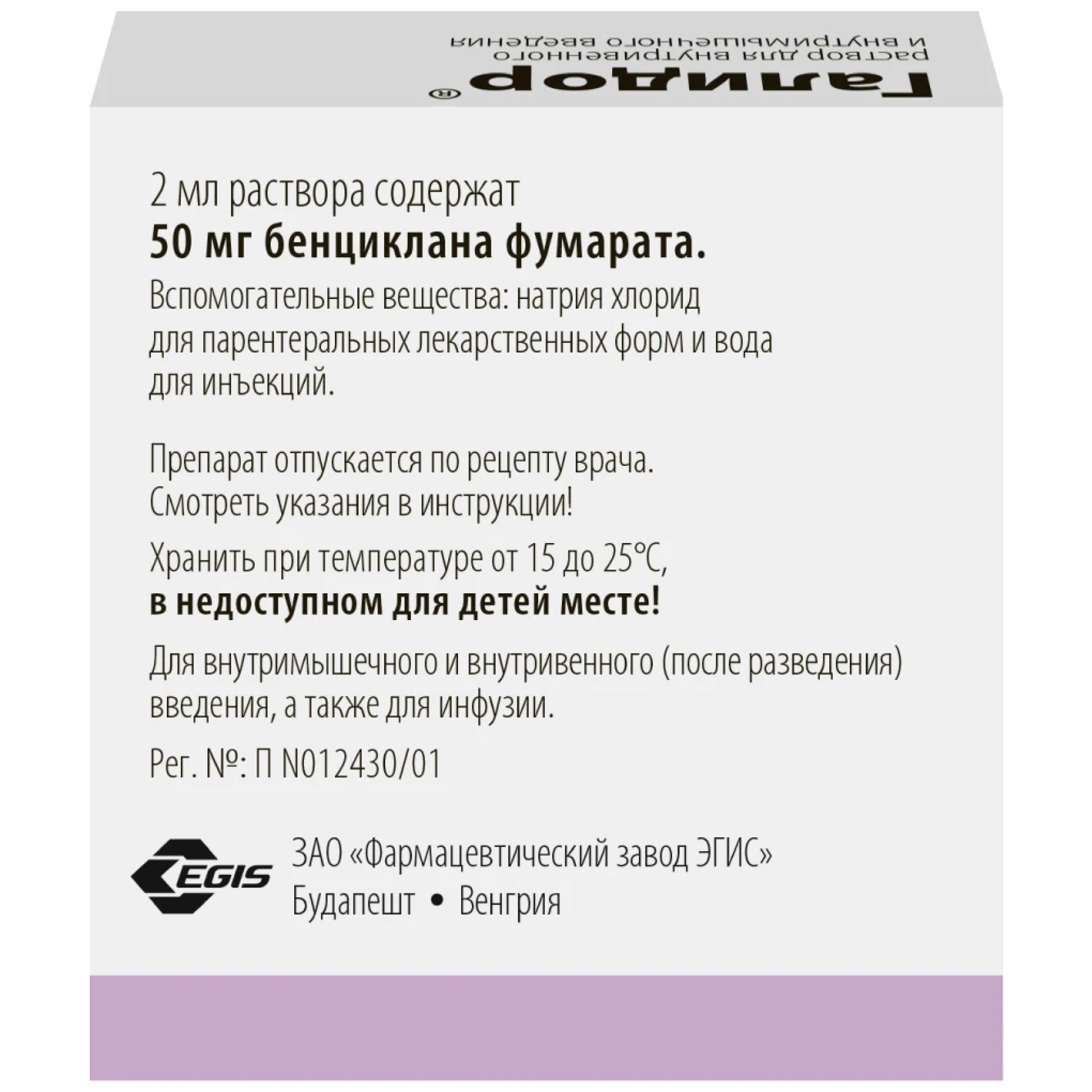 Кроме того, бенциклан обладает спазмолитическим действием на висцеральную мускулатуру (ЖКТ, мочевыводящих путей, органов дыхания).