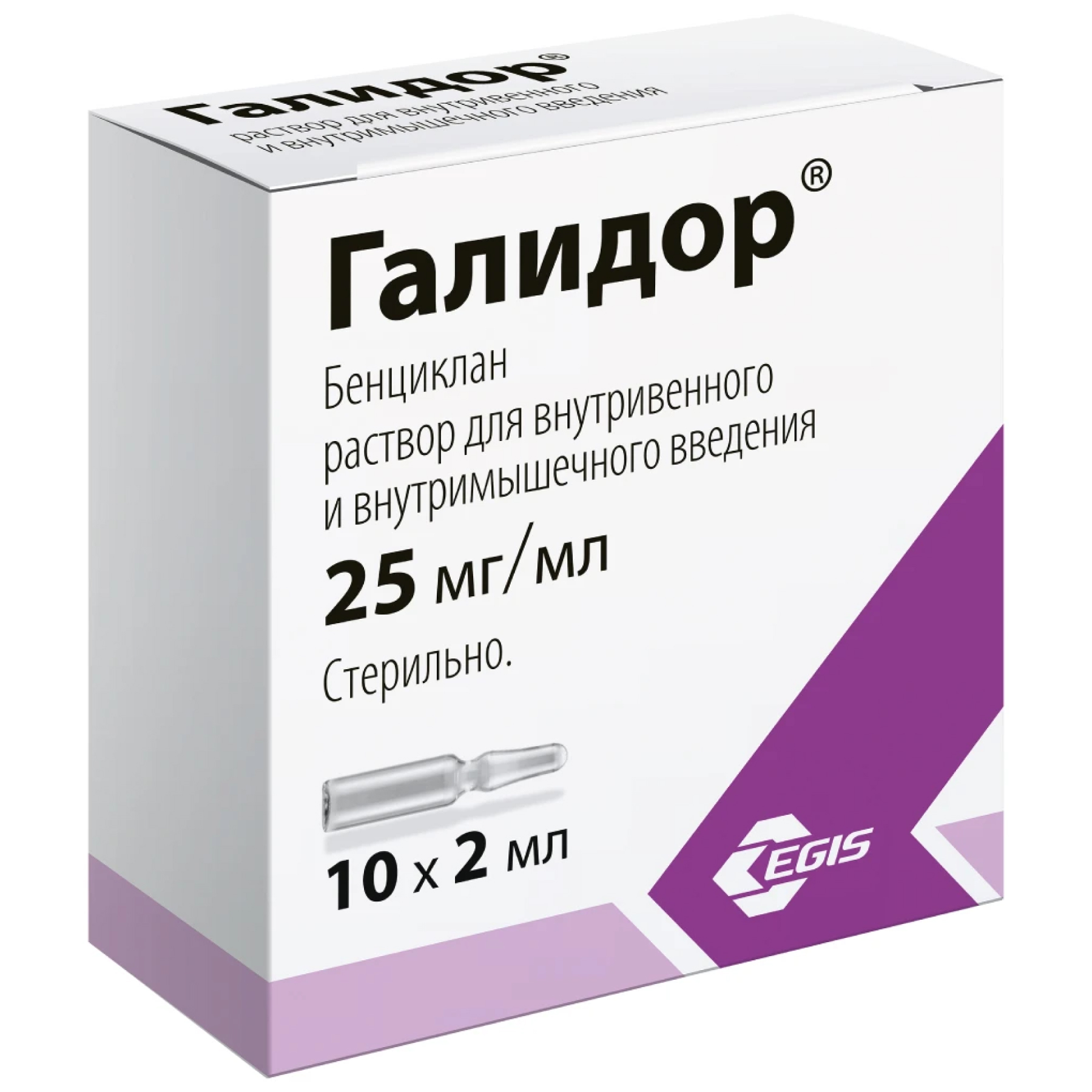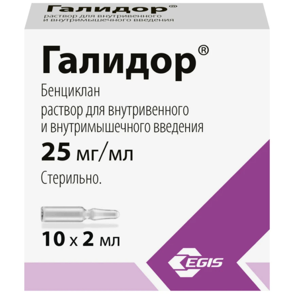 В острых случаях Галидор® вводят в/в медленно в дозе 100-200 мг (4-8 мл) или в/м глубоко в дозе 50 мг (2 мл). Перед в/в введением необходимое количество раствора разводят с помощью изотонического раствора натрия хлорида до 10-20 мл. Курс лечения составляет 2-3 недели с последующим переводом пациента, при необходимости, на прием препарата Галидор® внутрь.