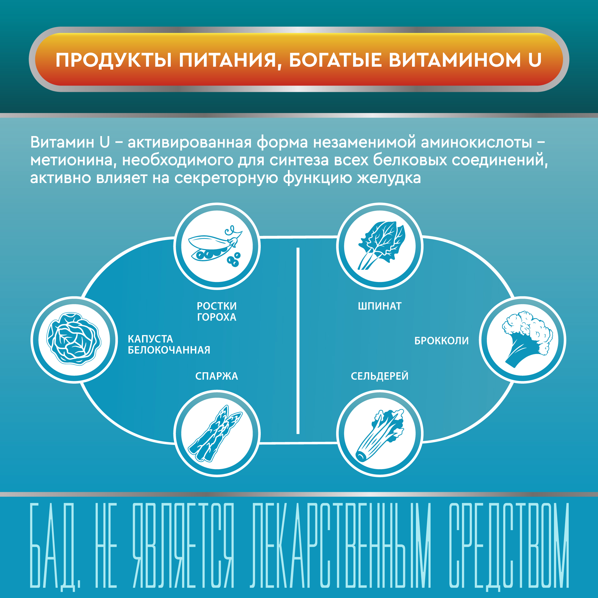 Витамин U стимулирует заживление повреждений слизистой оболочки желудочно-кишечного тракта. Это объясняется способностью витамина U отдавать свои метильные группы, необходимые для репаративных восстановительных процессов в организме. Метилируя гистамин, витамин U превращает его в неактивную форму, а это способствует уменьшению желудочной секреции. Таким образом, витамин U способствует активации восстановительных процессов в слизистой оболочке желудочно-кишечного тракта.