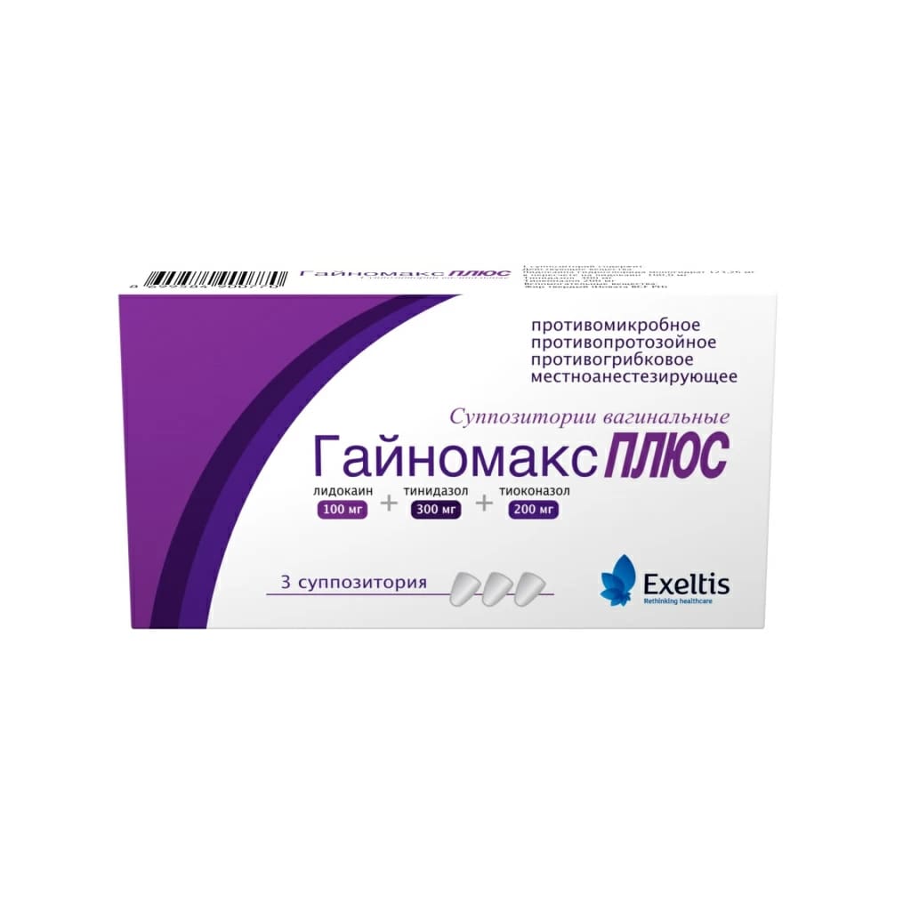 Гайномакс плюс - комбинированный препарат для интравагинального применения в гинекологии, действие которого обусловлено входящими компонентами: тинидазол, тиоконазол, лидокаин.