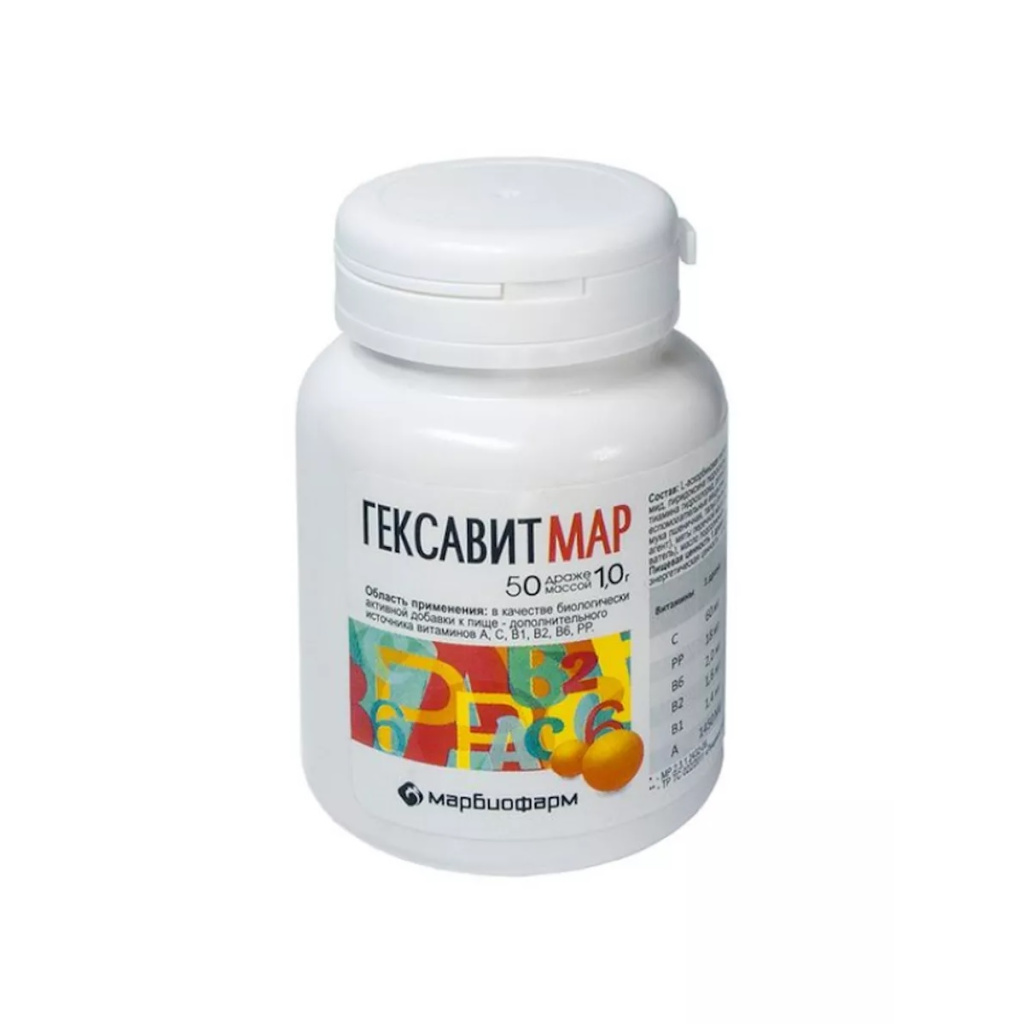 Активные вещества: ретинола пальмитат (витамин А) 2,75 мг (5000 МЕ), тиамина гидрохлорид (витамин В1) 2 мг, рибофлавин (витамин В2) 2 мг, никотинамид 15 мг, пиридоксина гидрохлорид (витамин B6) 2 мг, аскорбиновая кислота (витамин С) 70 мг;