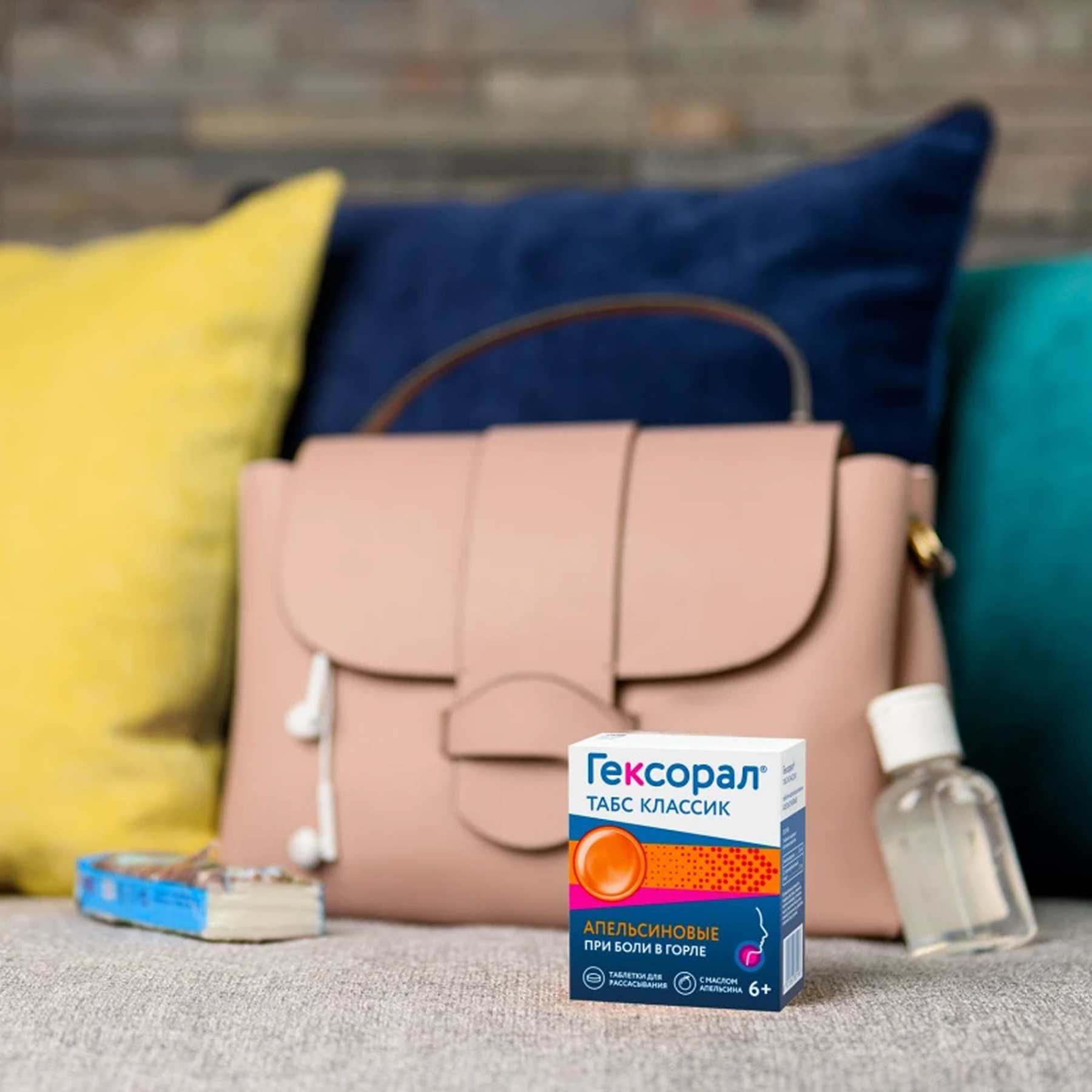 Все аналогиТаблетки для рассасывания Гексорал® табс Классик апельсиновые направлены на ослабление боли в горле. Рекомендуется применять при первых симптомах боли в горле, а также при першении. Дополнительные компоненты аниса, лимона, апельсина и масла мяты, входящие в состав, дают приятный, освежающий вкус.