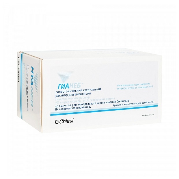 Гианеб – продукт инновационной технологии для терапии пациентов с бронхоэктазами и муковисцидозом. Ингаляции раствора, благодаря осмотическому механизму, ускоряют отхождение в дыхательных путях мокроты (вязкого секрета). Действие активных компонентов продукта обеспечивает его эффективность: натрия хлорид: содержание натриевой соли соляной кислоты в высоких концентрациях притягивает влагу, способствуя регидратации бронхиального секрета; гиалуроновая кислота: обладает способностью связывать в большом количестве молекулы H2O (воды) и удерживать их в межфибриллярном пространстве, является важным элементом защитных механизмов, стимулирует движение ресничек мерцательного эпителия бронхов, защищает легочную паренхиму от пагубного влияния ферментов. Переносимость Гианеба и приверженность пациентов к терапии значительно улучшается благодаря наличию в составе гиалуроновой кислоты.