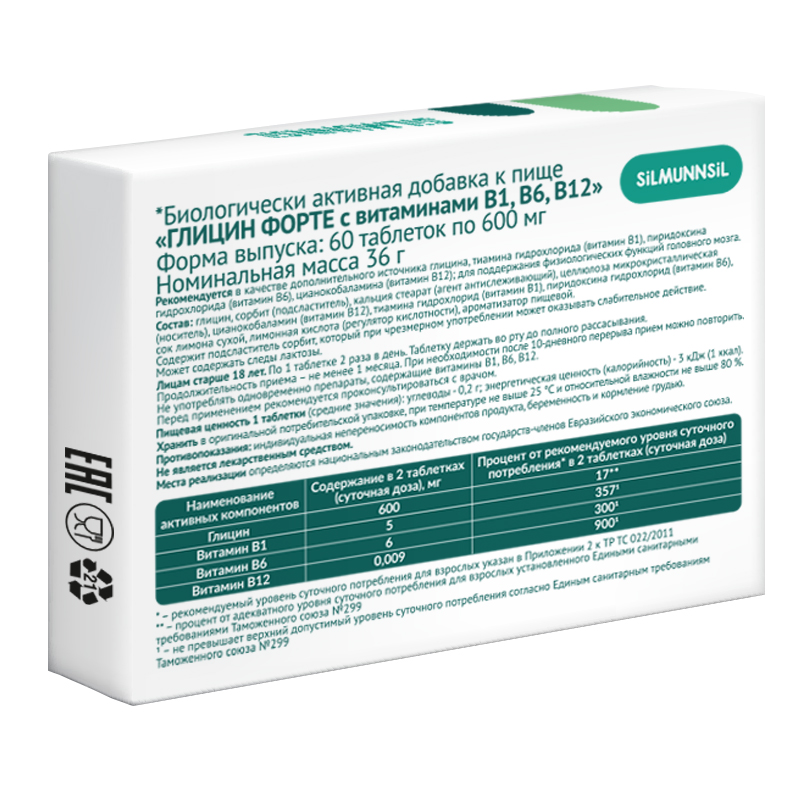 Рекомендуется в качестве дополнительного источника глицина, тиамина гидрохлорида (витамин В1), пиридоксина гидрохлорида (витамин В6), цианокобаламина (витамин В12); для поддержания физиологических функций головного мозга.