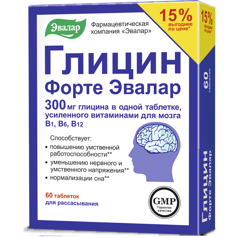 Компания «Эвалар» производит Глицин форте Эвалар в таблетках, аналогичный зарубежным – с повышенным содержанием глицина и витаминов, что положительно влияет на деятельность нервной системы: способствует повышению умственной работоспособности, снижению повышенной раздражительности, нормализации сна.
