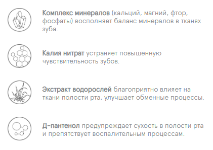 Обеспечивает насыщение зубов необходимыми микроэлементами – кальцием, магнием и калием. Восстановление минерального баланса в тканях зуба способствует осветлению эмали. Комплекс дополнительно оказывает укрепляющее действие на эмаль и снижает симптомы чувствительности.