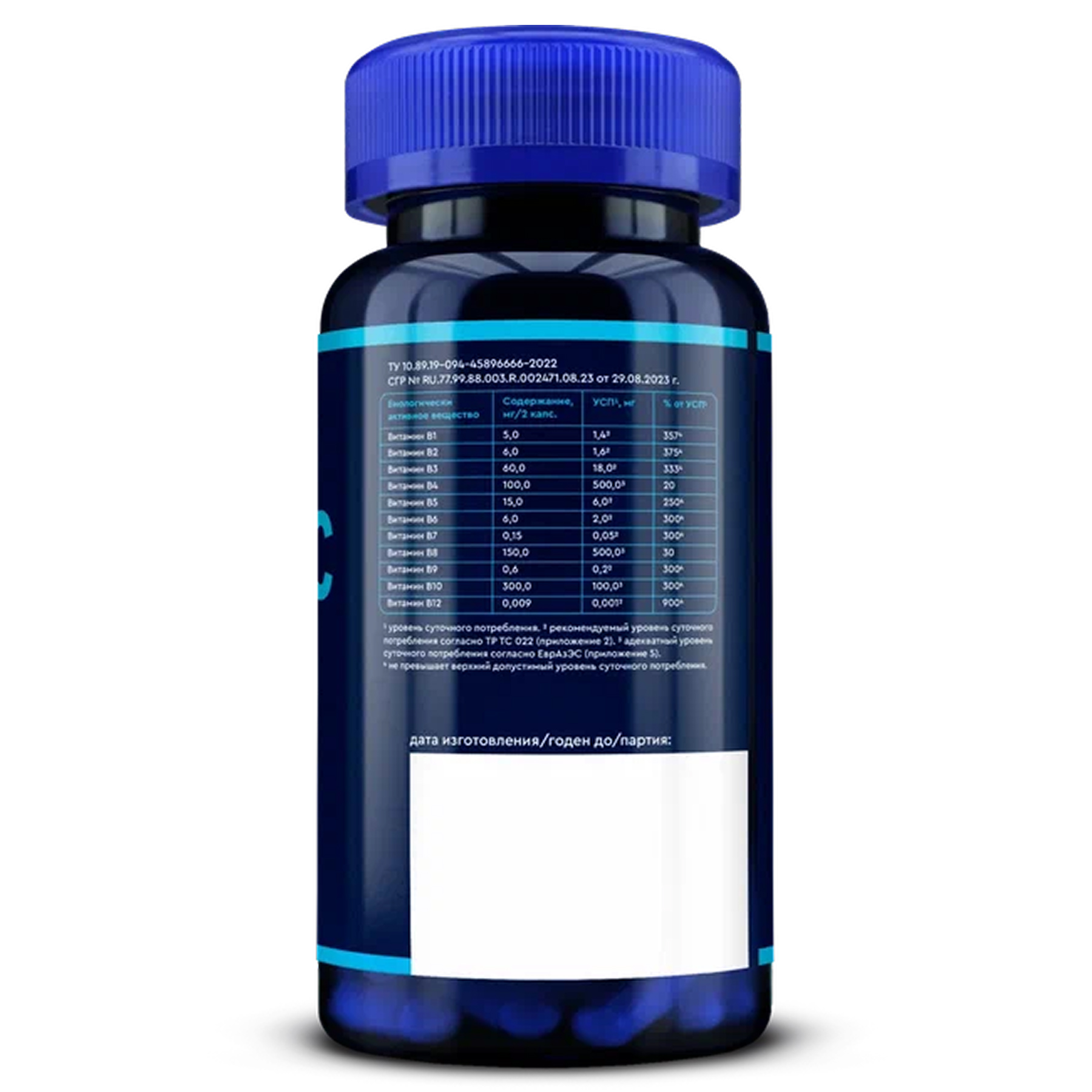 1 вегетарианская капсула содержит: Витамин В1 (тиамина гидрохлорид) — 1,4 мг; Витамин В2 (рибофлавин) — 1,6 мг; Витамин В3 (никотинамид) — 18 мг; Витамин В5 (кальция D-пантотенат) — 6 мг; Витамин В6 (пиридоксина гидрохлорид) — 2 мг; Витамин В9 (фолиевая кислота) — 0,2 мг; Витамин В12 (цианокобаламин) — 0,001 мг; Биотин — 0,15 мг.
