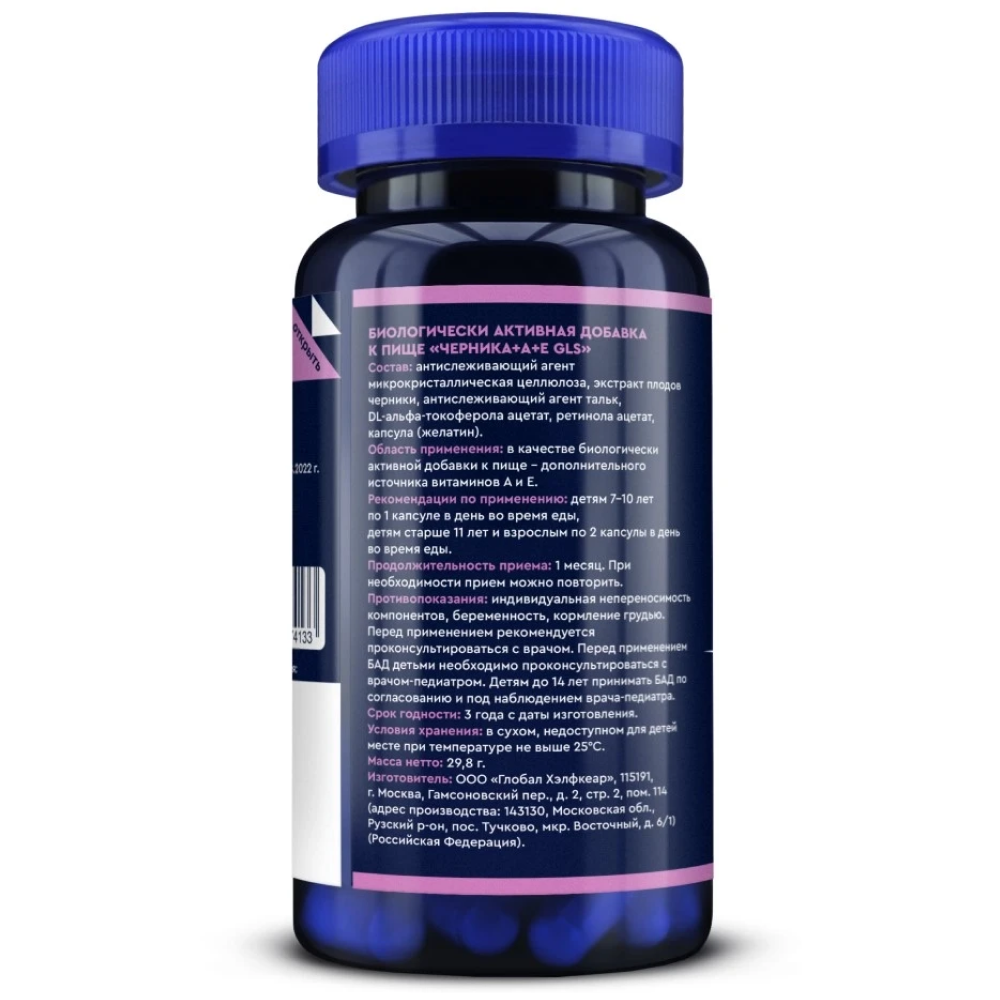 GLS ЧЕРНИКА+А+Е обладает антиоксидантным действием, защищает ткани глаза от повреждения свободными радикалами.