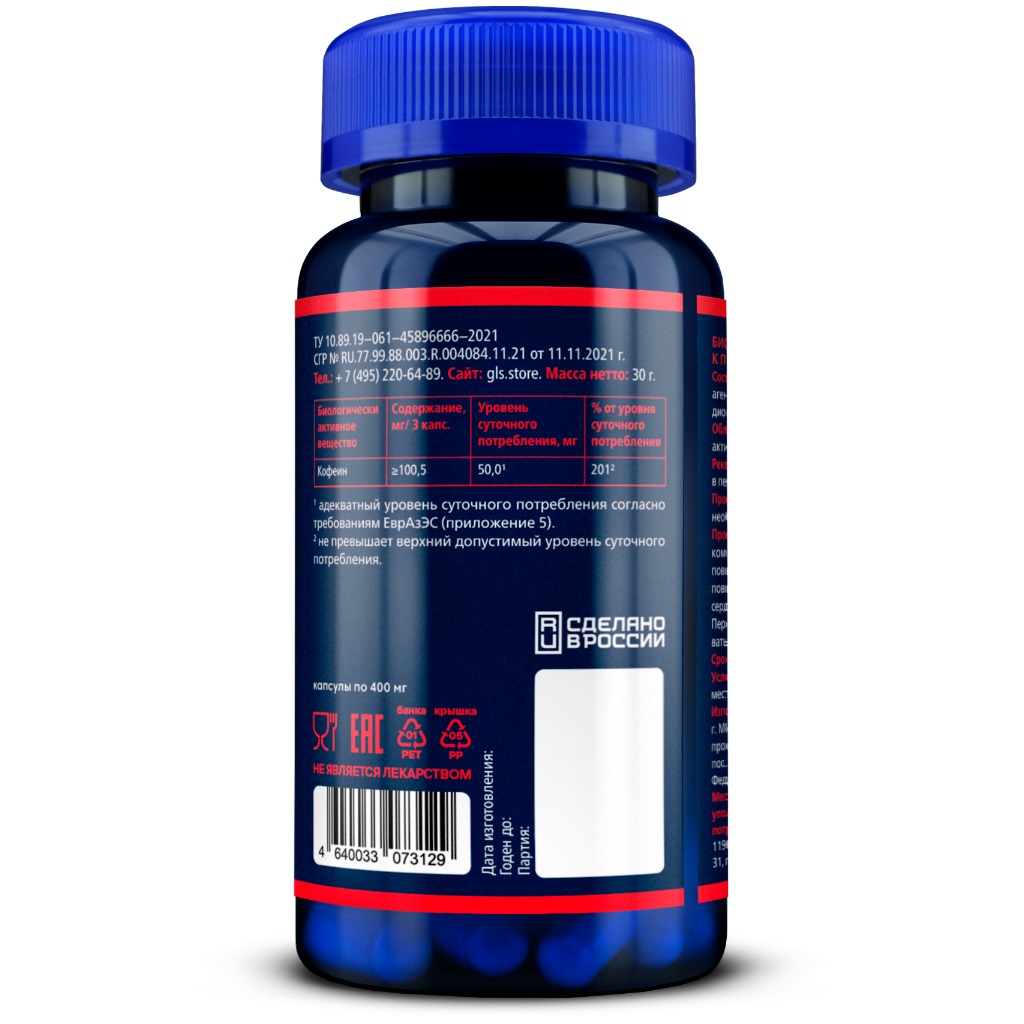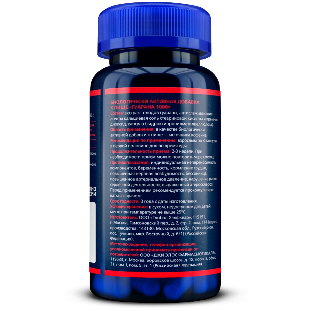 Gls гуарана 1000 60 шт. капсулы массой 400 мг - это биологически активная добавка к пище, содержащая в 3 капсулах плодов гуараны 1005 мг, в том числе кофеина не менее 100,5 мг. Биологически активная добавка (БАД) к пище - положительно влияет на концентрацию внимания и память, придает бодрости, повышает настроение. Стимулирует физическую активность, способствует повышению выносливости при занятиях спортом. Есть противопоказания, перед применением рекомендуется проконсультироваться с врачом.