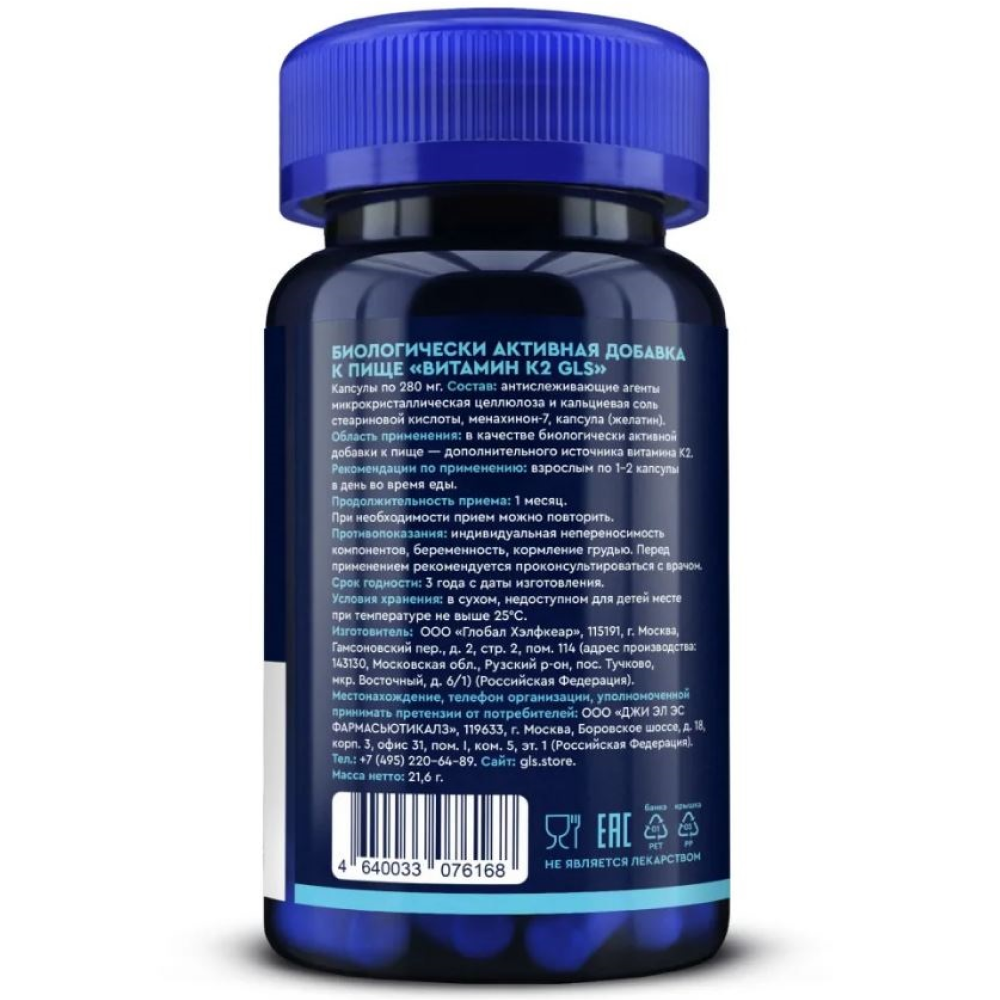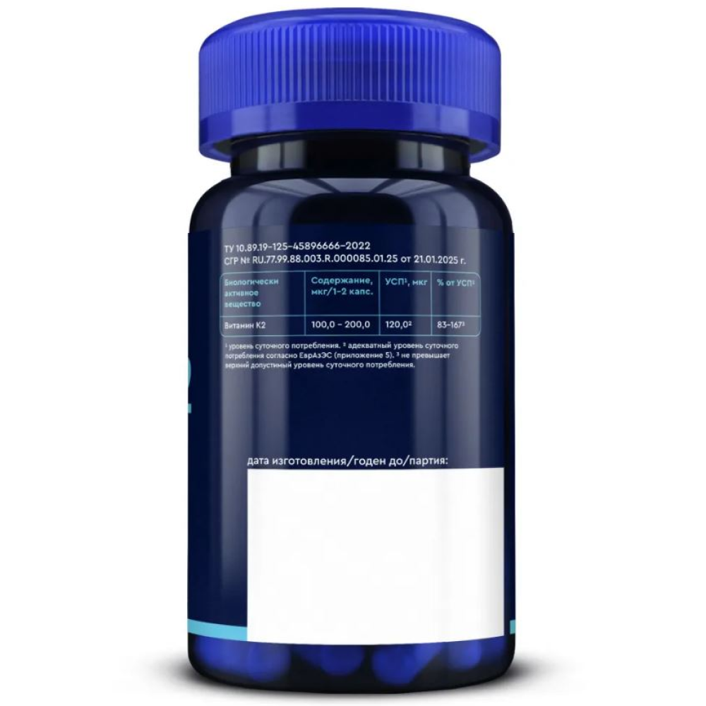 1-2 капсулы (суточная дозировка) содержат: Витамин К2 (менахинон-7) — 100 - 200 мкг. Вспомогательные вещества: антислеживающие агенты микрокристаллическая целлюлоза, кальциевая соль стеариновой кислоты, капсула (желатин).