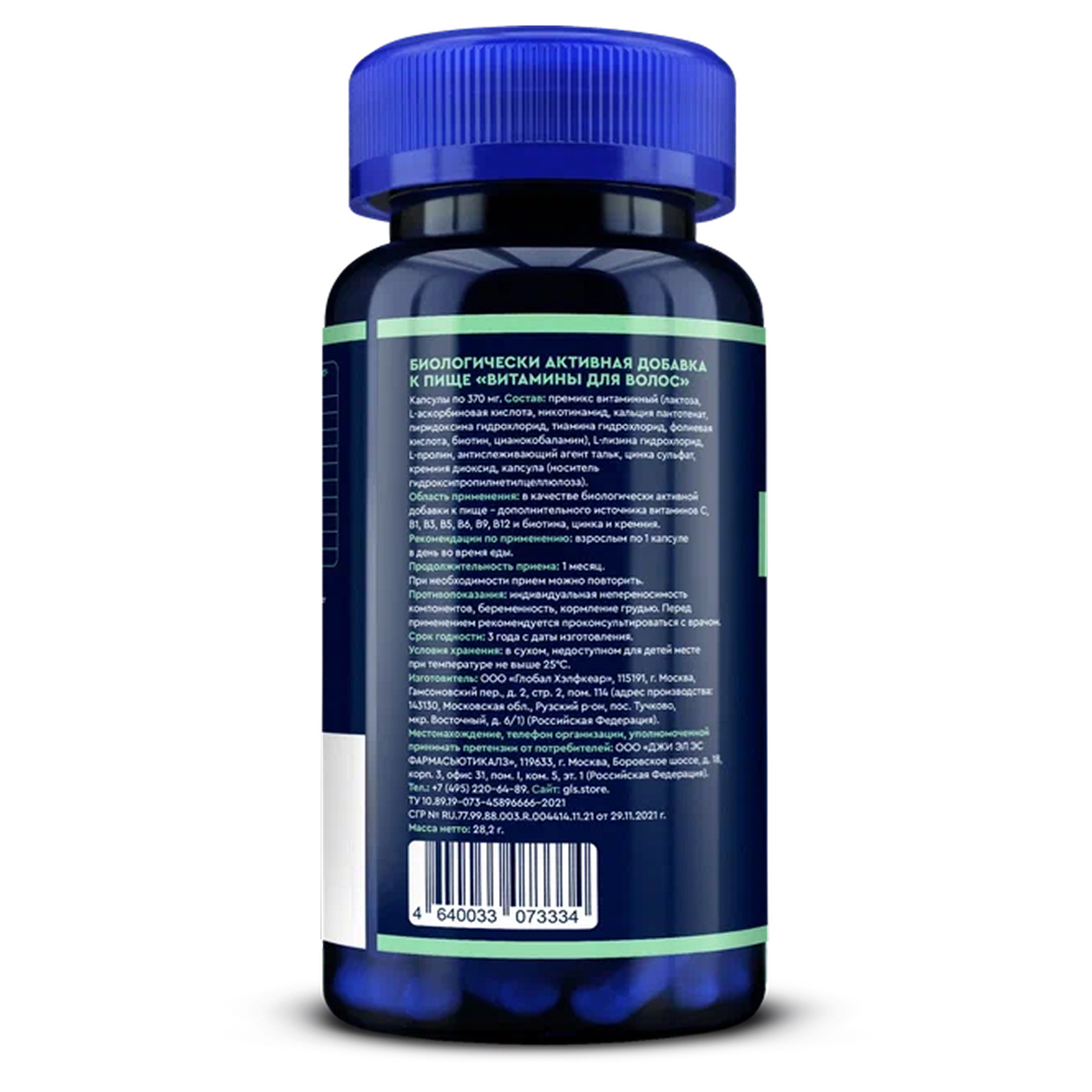 Вспомогательные вещества: антислеживающий агент тальк, капсула (гидроксипропилметилцеллюлоза).