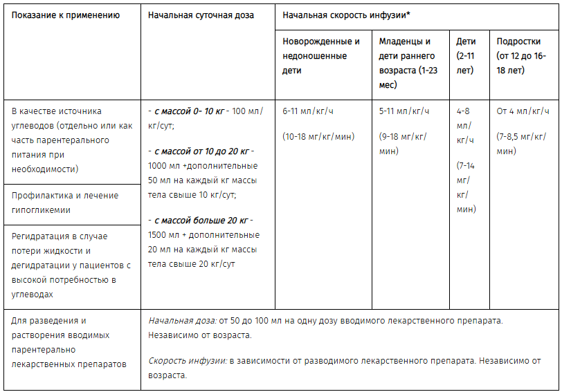 5% раствор глюкозы: рекомендуемая доза в качестве источника углеводов (отдельно или как часть парентерального питания при необходимости):
