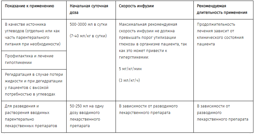 5% раствор глюкозы: в качестве источника углеводов (отдельно или как часть парентерального питания при необходимости); для регидратации в случае потери жидкости, особенно у пациентов с высокой потребностью в углеводах; для разведения и растворения вводимыx парентерально лекарственных препаратов.