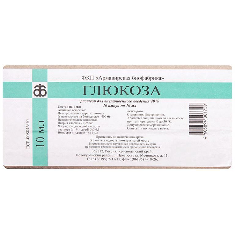 Для приготовления 10% раствора глюкозы необходимо взять 1 часть 40% раствора глюкозы й 3 части воды, т.е.: смешать 5 мл 40% раствора глюкозы с 15 мл воды для инъекций (для ампулы объемом 5 мл), либо смешать 10 мл 40% раствора глюкозы с 30 мл воды для инъекций (для ампулы объемом 10 мл).