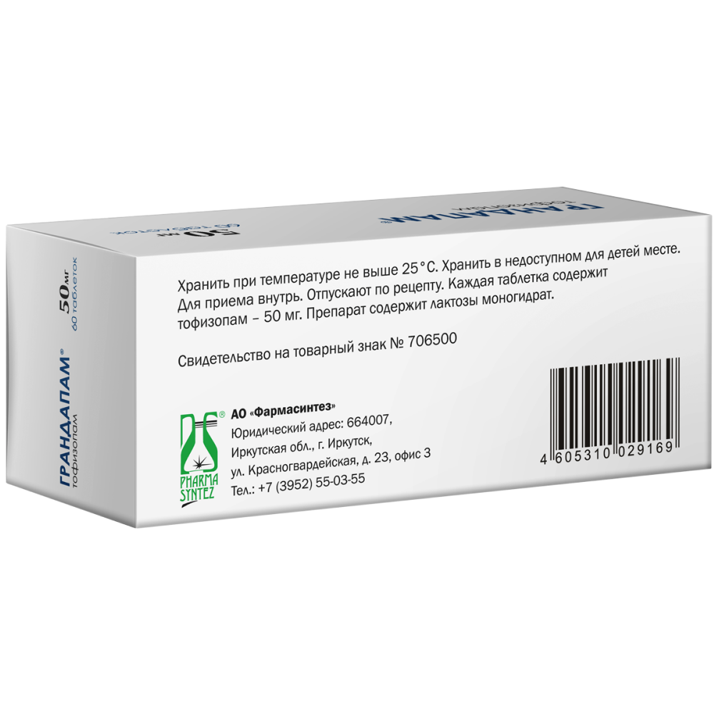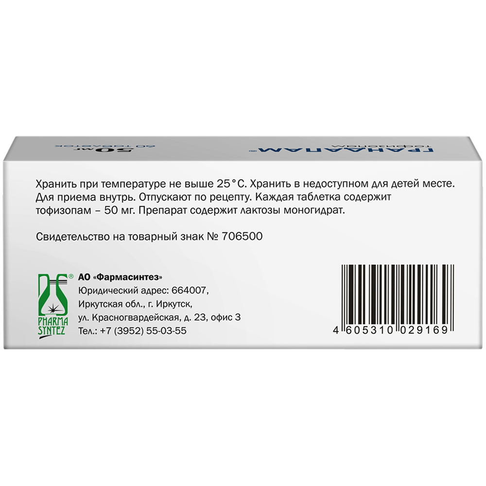 Действующее вещество: тофизопам – 50,0 мг.
