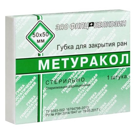 Губка для закрытия ран метуракол 50х50 мм в индивидуальной упаковке - это комбинированное медицинское изделие, состоящее из коллагена и метилурацила. Представляет собой мелкопористые сухие пластины белого цвета со слабым специфическим запахом. Губка оказывает противовоспалительное действие, стимулирует репаративные процессы в ранах, ускоряя рост и созревание грануляционной ткани и эпителизацию, обладает гемостатическим эффектом. «Метуракол» применяют в качестве местного средства при комплексном лечении трофических язв, пролежней, глубоких и длительно незаживающих ран, поверхностных ожогов кожи. При наложении на рану «Метуракол» плотно прилегает к ее поверхности, впитывает раневое отделяемое, набухает и постепенно лизируется, освобождая входящий в ее состав метилурацил. Предварительно рану следует обработать растворами антисептиков и удалить остатки некротических тканей. «Метуракол» накладывают на раневую поверхность в виде аппликации так, чтобы он плотно прилегал ко дну и стенкам раны, а края выходили за пределы раны на 1 -1,5 см. Поверх препарата накладывают фиксирующую повязку. В среднем перевязку рекомендуется производить 1 раз в 2 — 3 дня (если нет промокших участков), т. к. за этот срок «Метуракол» полностью лизируется. Эта губка является эффективным и надежным средством, которое подходит для использования в домашних условиях или в путешествиях. Перед применением рекомендуется проконсультироваться с врачом.