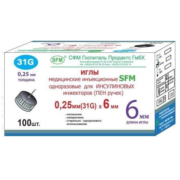 Иглы SFM для шприц ручек для одноразового использования с инсулиновыми инжекторами, для подкожного введения инсулина. Тонкие иглы совместимы со шприц ручками ведущих производителей: Eli Lilly (ХумаПен Эрго, ХумаПен Люксура, Баета), Becton Dickinson (BD Micro-Fine Plus) Novo Nordisk (НовоПен 3, НовоПен 3 Деми, ФлексПен) Sanofi-Aventis (ОптиКлик, ОптиПен Про1). Иглы короткой длины (4-6 мм) подходят для детей и людей с худым телосложением. Иглы средней длины (6-8 мм) предназначены для инъекций, которые выполняются в кожную складку под углом 90°, подходят для подростков и людей с худым телосложением. Длинные иглы (более 8 мм) используют для инъекций, которые выполняются в кожную складку под углом 45°, подходят взрослых людей крупного телосложения. Одноразовые иглы для инсулиновых инжекторов стерильные, нетоксичные, апирогенные, с уникальной тонкостенной технологией иглы с увеличенным просветом.