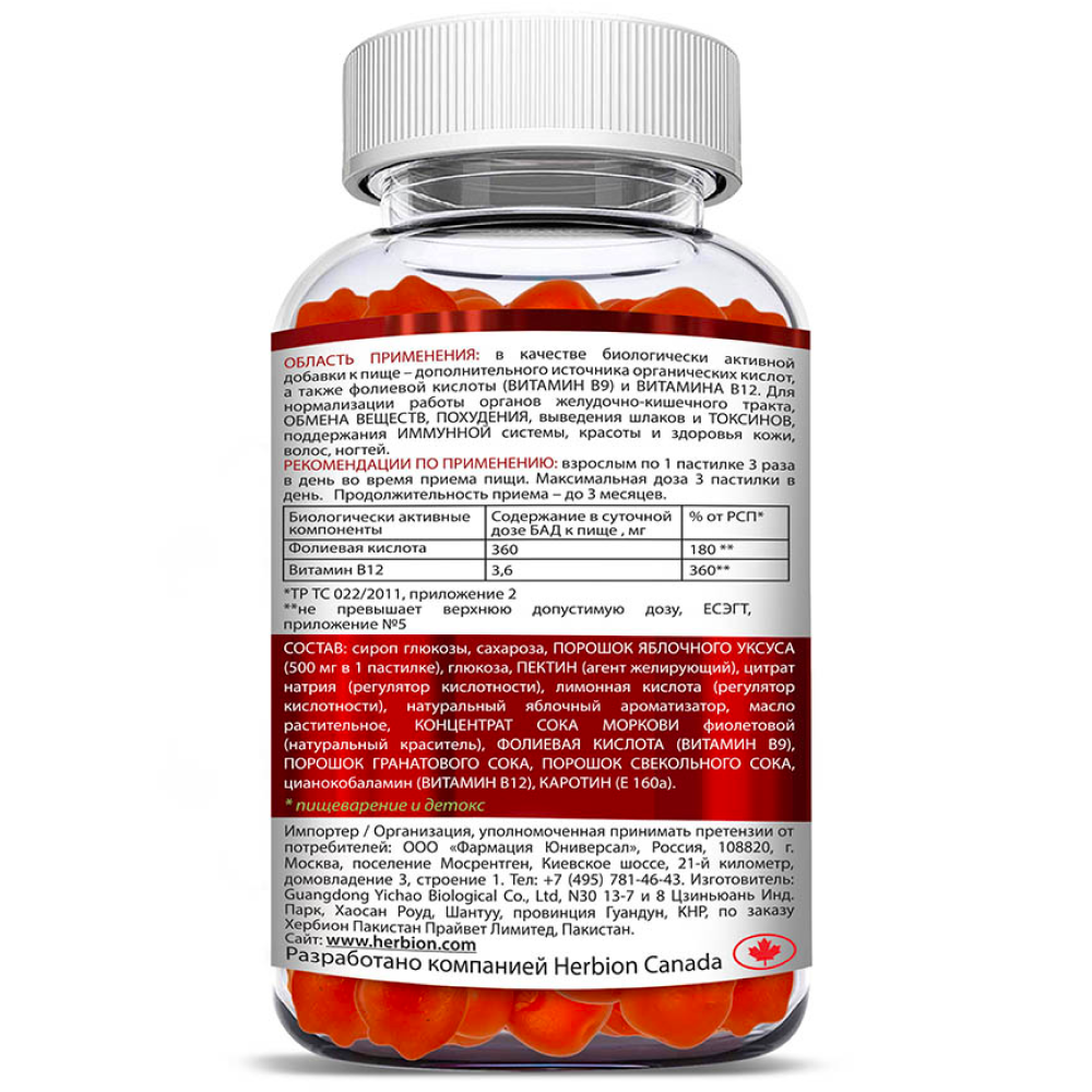 Сироп глюкозы, сахароза, порошок яблочного уксуса (500 мг в 1 пастилке), глюкоза, ПЕКТИН, цитрат натрия, лимонная кислота, натуральный яблочный ароматизатор, масло растительное, концентрат сока моркови фиолетовой, фолиевая кислота, порошок гранатового сока, порошок свекольного сока, цианокобаламин (Витамин B12), каротин.