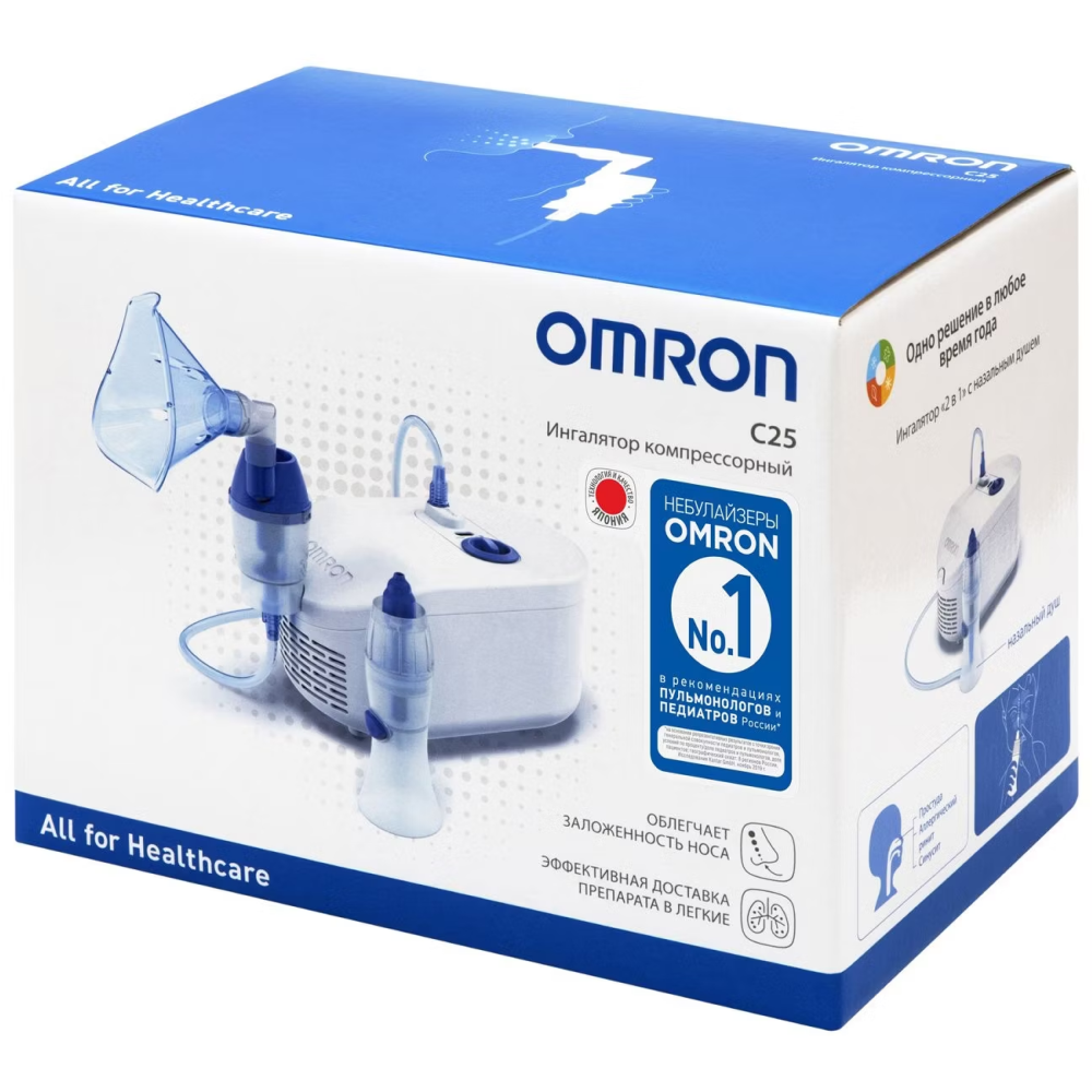 OMRON C25 является универсальным устройством 2 в 1: с его помощью можно проводить ингаляции дыхательных путей, а также промывать нос. Мощный прибор подходит для использования взрослыми и детьми. В комплекте идут специальные маски для разного возраста, а также специальная насадка для промывания.