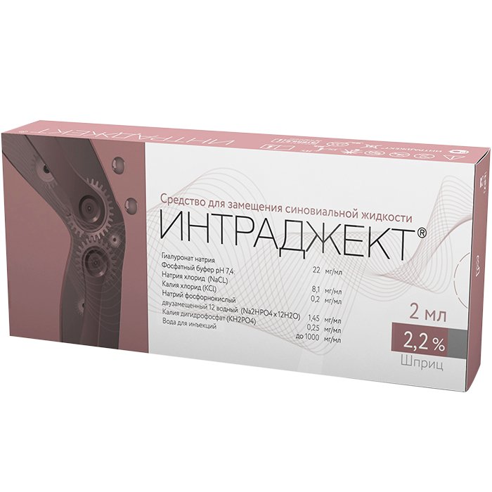 Вязкоэластичные свойства гиалуроновой кислоты, входящей в состав синовиальной жидкости, обеспечивают смазывание и амортизацию суставных поверхностей. Синовиальная жидкость в суставах при дегенеративных заболеваниях (остеоартроз) или травматических изменениях суставов, имеет более низкую вязкость и эластичность, чем в здоровых суставах. Гиалуроновая кислота, входящая в состав Средства ИНТРАДЖЕКТ®, имеет молекулярную массу 2,2 млн. дальтон, близкую к естественной гиалуроновой кислоте человека, и оказывает положительный эффект после введения при диагнозе остеоартроз (остеоартрит). Внутрисуставное введение Средства ИНТРАДЖЕКТ® восстанавливает физиологические и реологические свойства синовиальной жидкости сустава, пораженного остеоартрозом. Вследствие этого уменьшается боль и дискомфорт, улучшается подвижность в суставе.