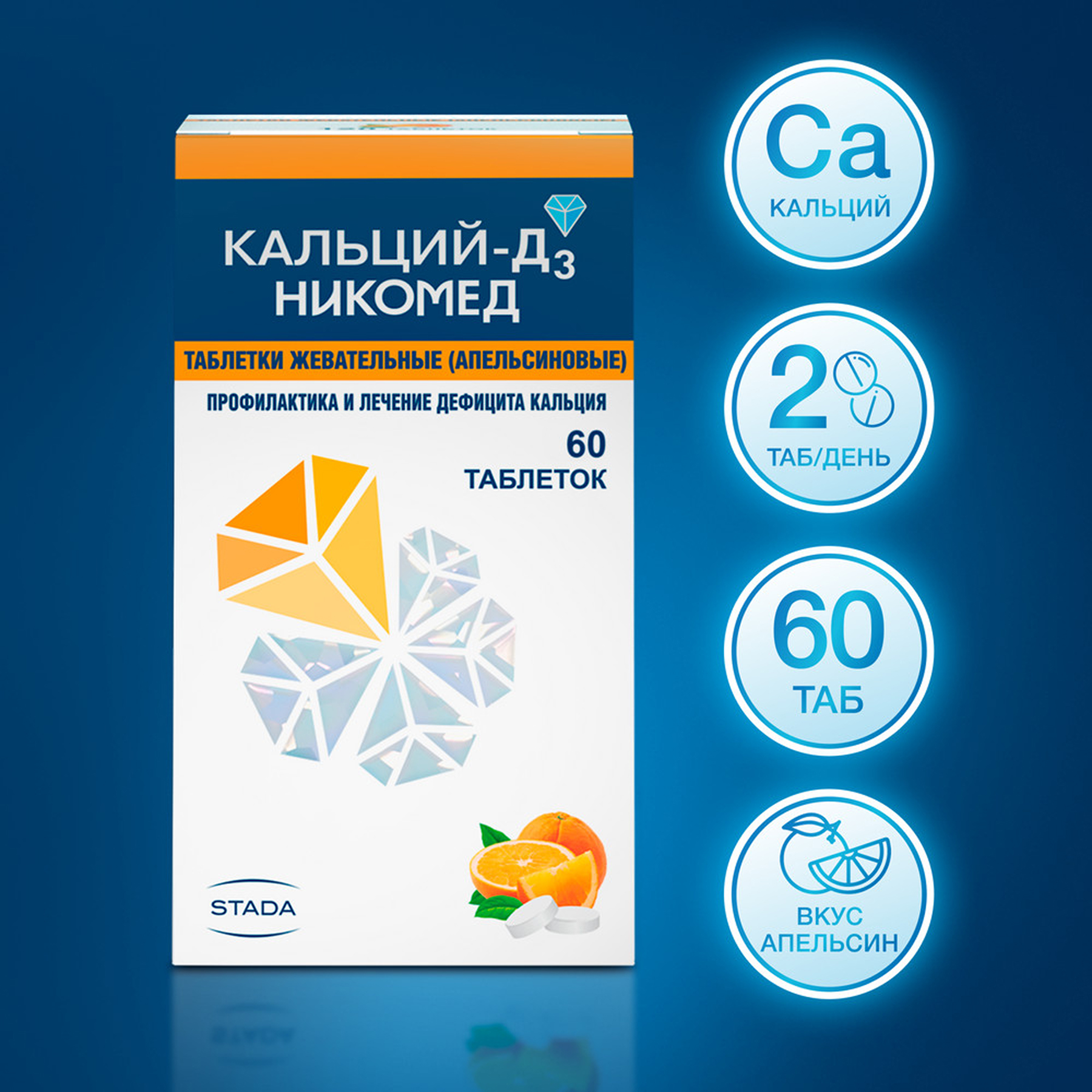 Снижает резорбцию (рассасывание) и увеличивает плотность костной ткани, восполняя недостаток кальция и витамина D3 в организме, необходим для минерализации зубов.