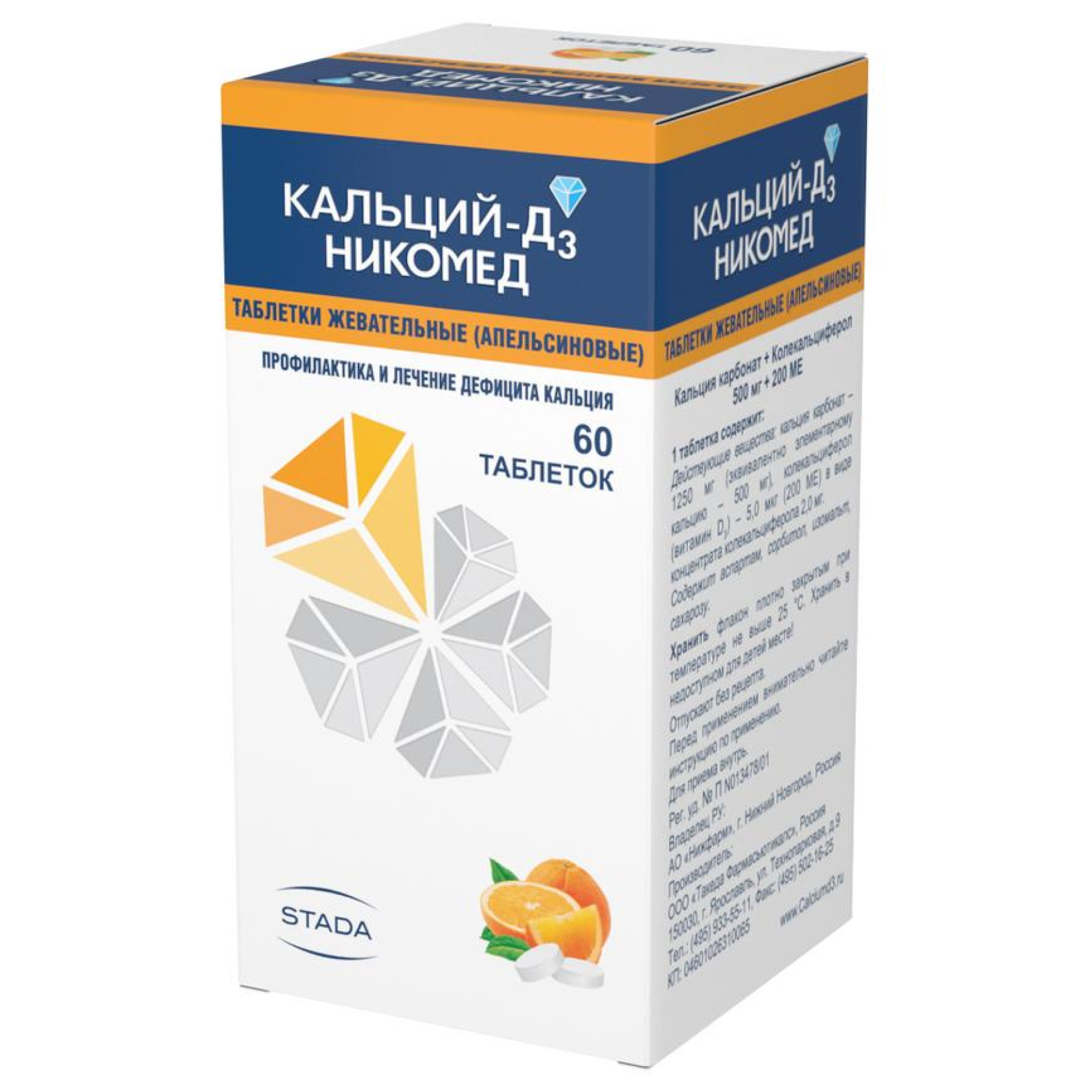 Активные вещества: кальция карбонат 1250 мг, эквивалентно элементарному кальцию 500 мг; колекальциферол (вит. D3) 5 мкг* (200 МЕ) в виде концентрата** колекальциферола 2 мг*.