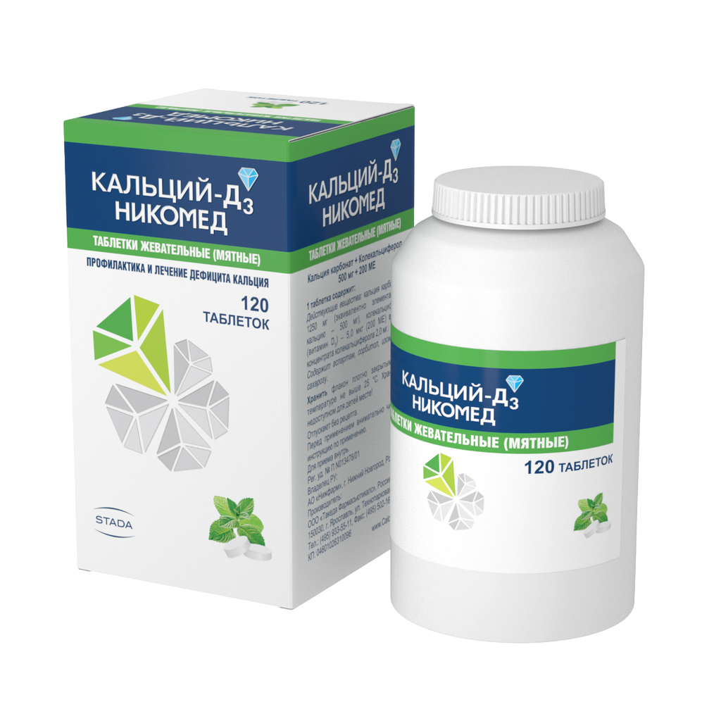 Активные вещества: кальция карбонат 1250 мг, эквивалентно элементарному кальцию 500 мг; колекальциферол (вит. D3) 5 мкг* (200 МЕ) в виде концентрата** колекальциферола 2 мг*.