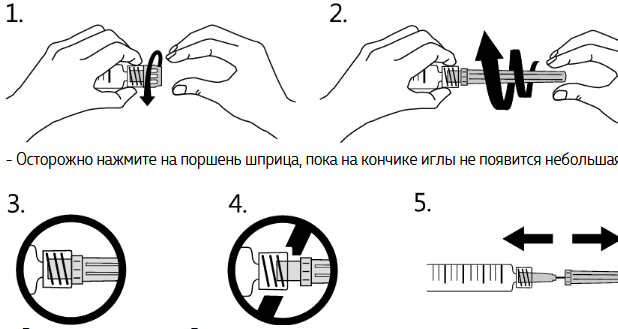 - Отвинтите защитный колпачок наконечника шприца в направлении по часовой стрелке (1).