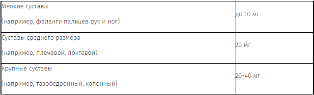 При поражении нескольких суставов общая доза препарата может составлять до 80 мг. При избыточном количестве синовиальной жидкости часть ее следует удалить при помощи шприца, чтобы избежать разбавления препарата.