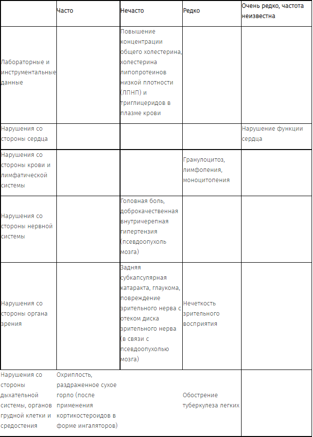 Возможно появление нарушения зрения при системном и местном применении ГКС. При появлении нечеткости зрительного восприятия или других нарушений зрения следует рассмотреть возможность консультации офтальмолога, чтобы исключить такие причины, как катаракта, глаукома или редкие заболевания, например, центральная серозная хориоретинопатия (CSCR), о которых сообщалось после системного и местного применения ГКС.