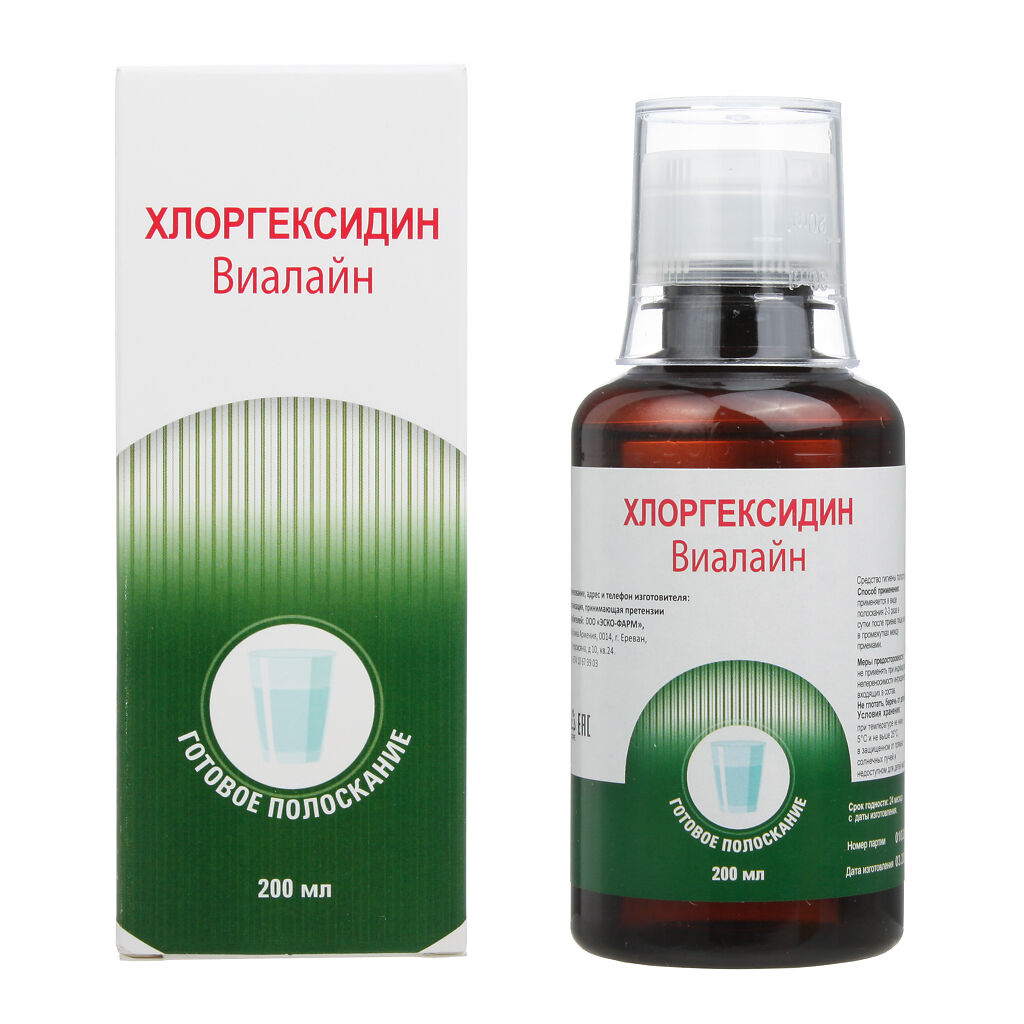 Готовое полоскание «Хлоргексидин Виалайн» - содержит хлоргексидина биглюконат и экстракт лимона, которые сочетают в себе антисептические и противовоспалительные свойства. Основное назначение раствора – удаление болезнетворных микроорганизмов и гнойных налетов.