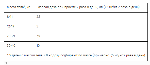 В таблице приведены рекомендации по дозированию у детей с учетом массы тела: