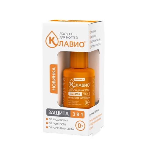 Основой лосьона КЛАВИО® является хитозан – биологический полимер, способствующий выравниванию структуры ногтевой пластины и защищающий ее от проникновения внешних агрессивных веществ и потери влаги.