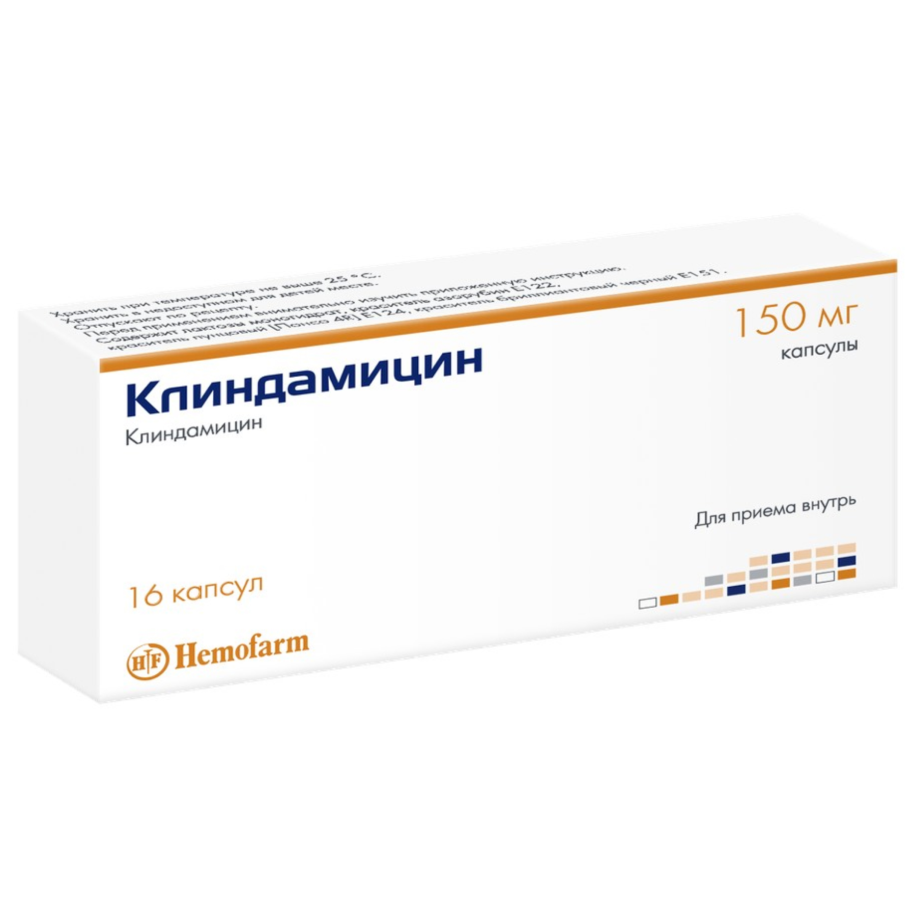 Действующее вещество: клиндамицин 150,00 мг (в виде клиндамицина гидрохлорида 162,88 мг);