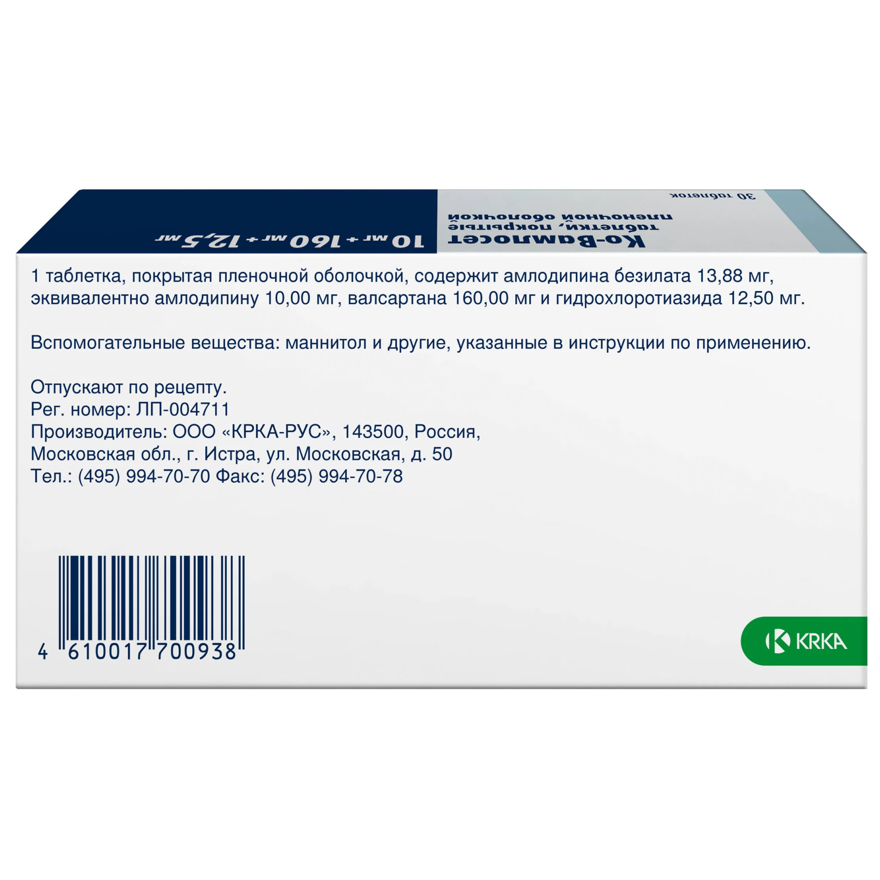 Ко-Вамлосет, 10 мг + 160 мг + 12,5 мг, таблетки, покрытые пленочной оболочкой