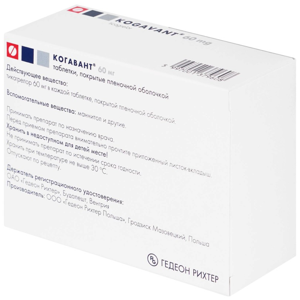 Каждая таблетка, покрытая пленочной оболочкой, содержит 60 мг тикагрелора.