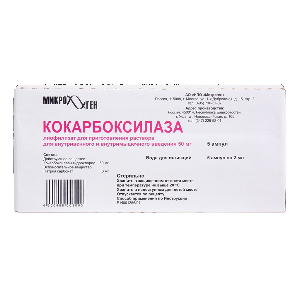 1 ампула с порошком для приготовления раствора для инъекций содержит кокарбоксилазы гидрохлорида 50 мг.