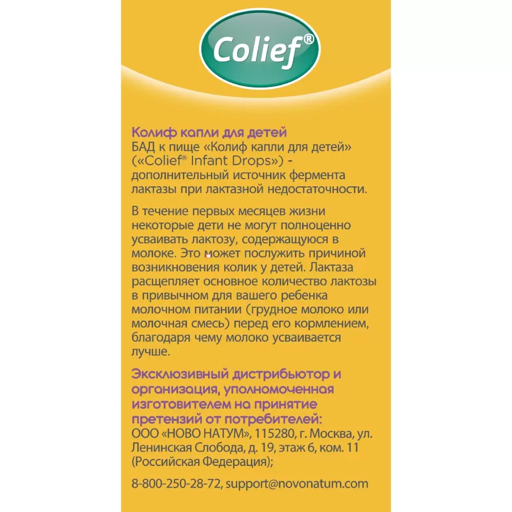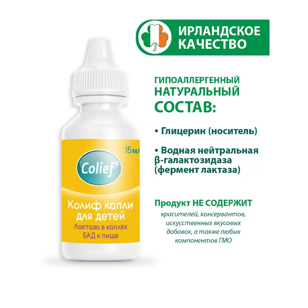 Колиф капли для детей (Colief® Infant Drops) является полностью натуральным средством, которое при добавлении в грудное молоко, компенсирует частичную лактазную недостаточность у малышей с коликами. Основное действующее вещество – это естественный и безопасный для организма фермент лактаза, который продуцируется тонким кишечником.