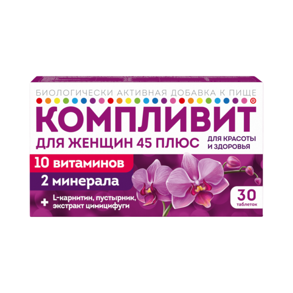 Витаминный комплекс восполняет дефицит витаминов с учетом суточной потребности у женщин в период возрастной гормональной перестройки (перименопауза). Дополнительные компоненты комплекса оказывают адаптогенное действие (пустырник), метаболическое действие (L-карнитин), а также регулирующее действие на гормональный баланс организма женщины (цимицифуга).