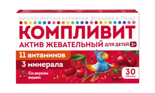 БАД к пище «Компливит® Актив жевательный» является дополнительным источником витаминов А, С, Е, D (в 1 таблетке – 60 МЕ), группы В (В1, В2, В3, В5, В6, В9, В12), минеральных элементов (магния, кальция, йода).