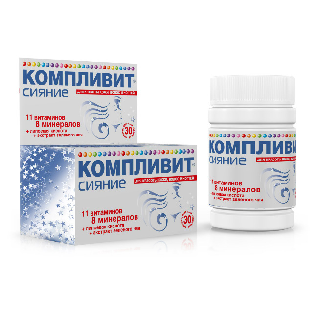 КОМПЛИВИТ® СИЯНИЕ представляет собой комплекс витаминов, минералов, витаминоподобных веществ и экстракта зеленого чая. Использование комплекса помогает улучшить состояние кожи, ногтей и волос, особенно в условиях неблагоприятной городской экологии. Действие комплекса обусловлено свойствами входящих в его состав компонентов.