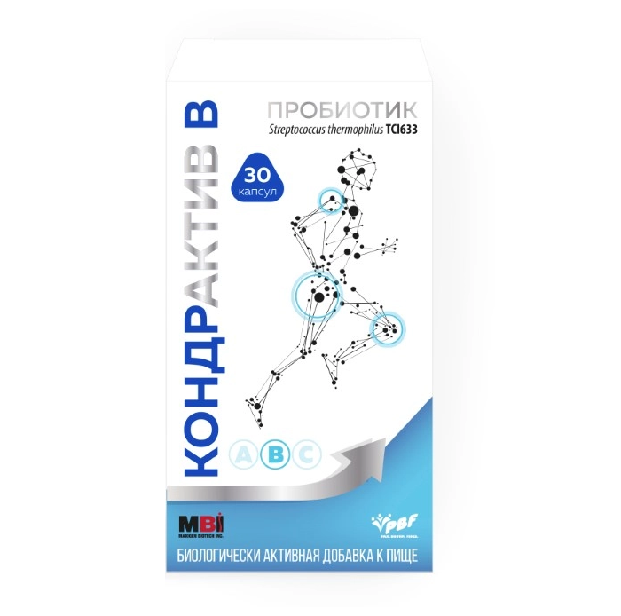 Кондрактив В содержит специальный вид микроорганизмов - Streptococcus thermophilus TCI633. Это пробиотик, способный вырабатывать гиалуроновую кислоту. Стимулирует пролиферацию клеток кожи, увеличивает содержание коллагена. Подавляет болевые ощущения, уменьшать отек суставов и воспаление синовиальной ткани и увеличивает синтез коллагена II типа в хряще.
