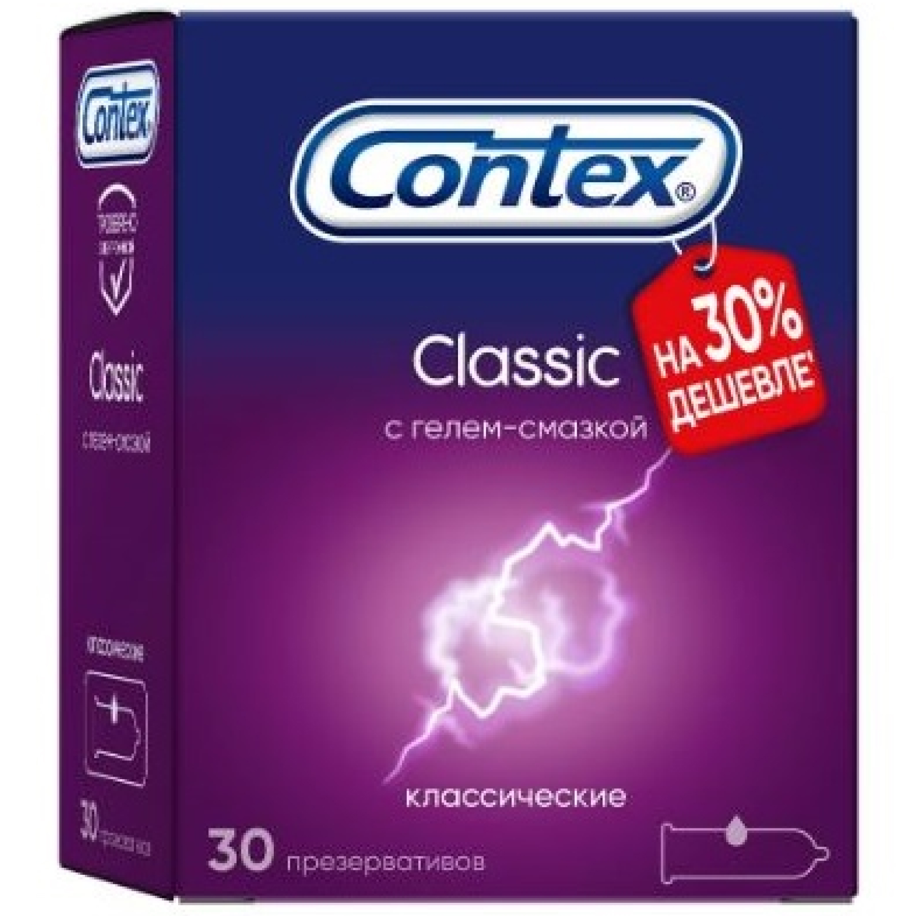 30 классических презервативов Contex Classic (Классик) в силиконовой смазке. Бесцветные, прямой формы, с накопителем. Номинальные размеры: длина – 180 мм, ширина – 52 мм. Смазка не разрушает сперматозоиды. Изготовлены из натурального латекса. Проверено электроникой. Только для одноразового использования. Презервативы CONTEX® являются средством предотвращения нежелательной беременности и профилактики заболеваний, передающихся половым путем (ЗППП), в т. ч. ВИЧ-инфекции.