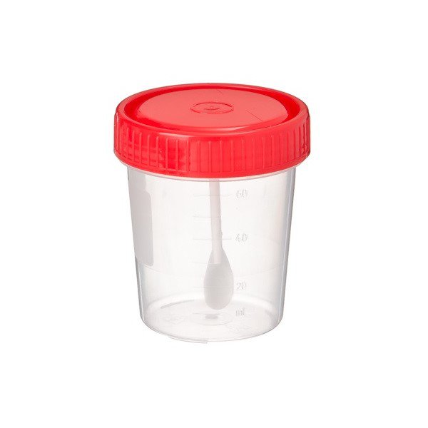 Стерильный контейнер объемом 60 мл с ложкой-шпателем, полем для надписей и градуировкой для взятия образцов биоматериала и транспортировки до места проведения анализов.