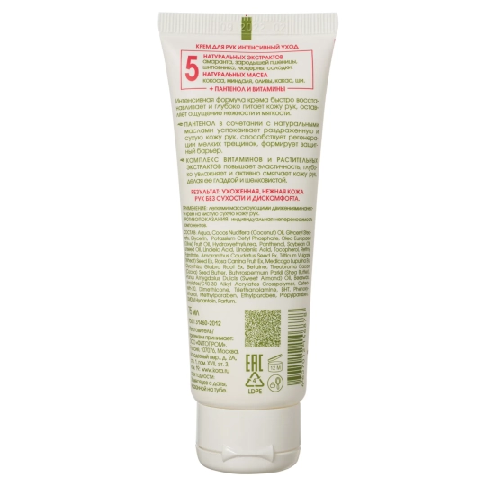 Интенсивная формула крема быстро восстанавливает и глубоко питает кожу рук, оставляет ощущение нежности и мягкости. Успокаивает раздраженную и сухую кожу рук, способствует регенерации мелких трещинок, формирует защитный барьер. Повышает эластичность, глубоко увлажняет и активно смягчает кожу рук, делая ее гладкой и шелковистой.