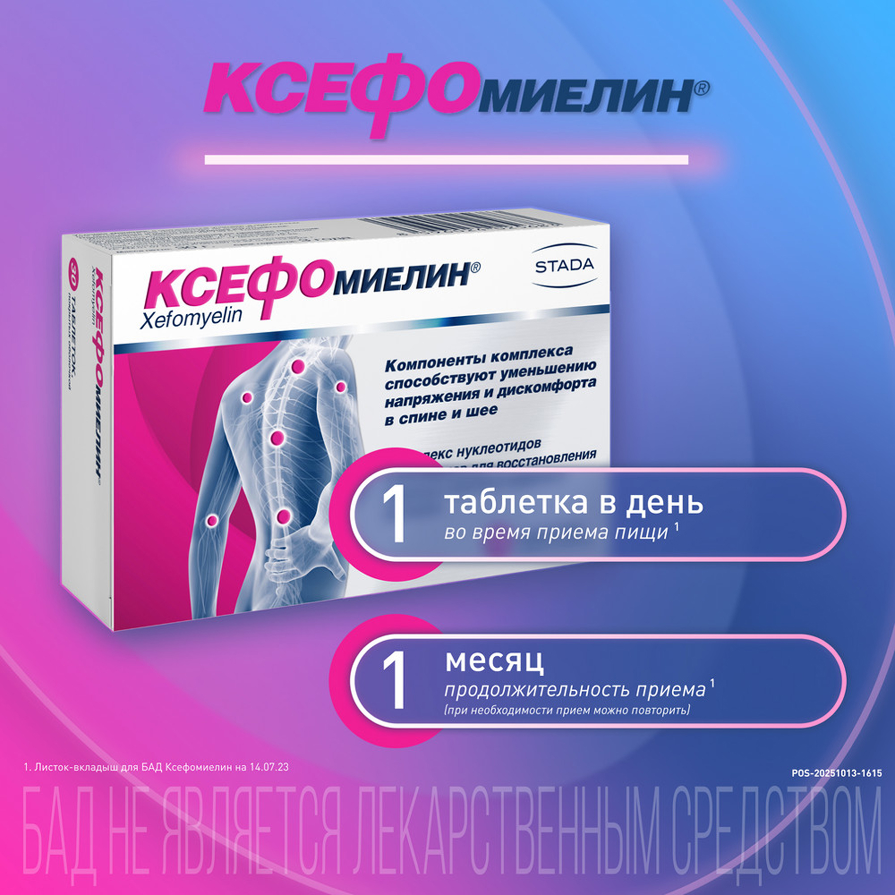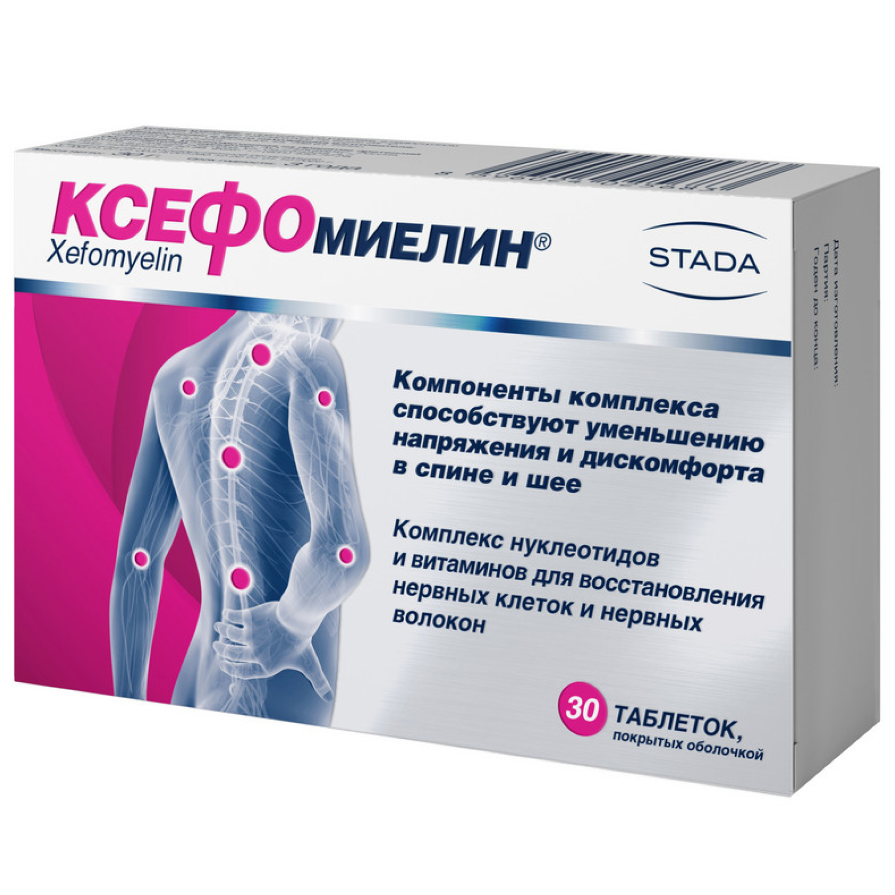 Биологически активная добавка к пище «Ксефомиелин» (далее Ксефомиелин) содержит важные компоненты (нуклеотиды и витамины), необходимые для восстановления нервных волокон и укрепления нервной системы. Благодаря оптимальному составу компоненты Ксефомиелина способствуют нормализации работы нервных волокон, уменьшению неприятных ощущений, напряжения и дискомфорта в мышцах спины, шеи, конечностей. Все это способствует повышению активности, подвижности и сохранению хорошего самочувствия.